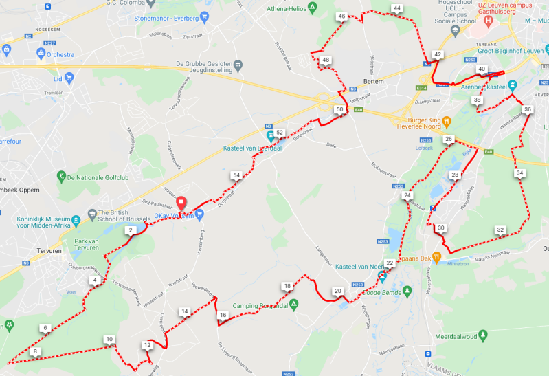 Meer dan 70% off road parcours van 56 km met passages door het Park van Tervuren, het Zoniënwoud, de kasseibeklimming van de Bekestraat (WK parcours Leuven 2022), de prachtige Voer en Dijle vallei, een mooi natuurreservaat, Heverleebos, Bertembos,...